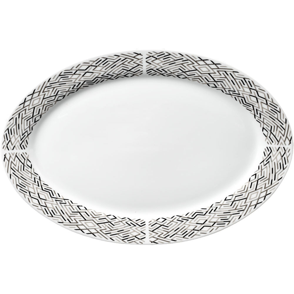 Πιατέλα από ποιοτική πορσελάνη, οβάλ σε λευκό χρώμα και διακόσμηση γκρι και μαύρες γραμμές περιμετρικά του πλαισίου. Ποιοτικά πιάτα για το καθημερινό σας τραπέζι και όχι μόνο, κατάλληλα για το πλυντήριο πιάτων και τον φούρνο μικροκυμάτων.