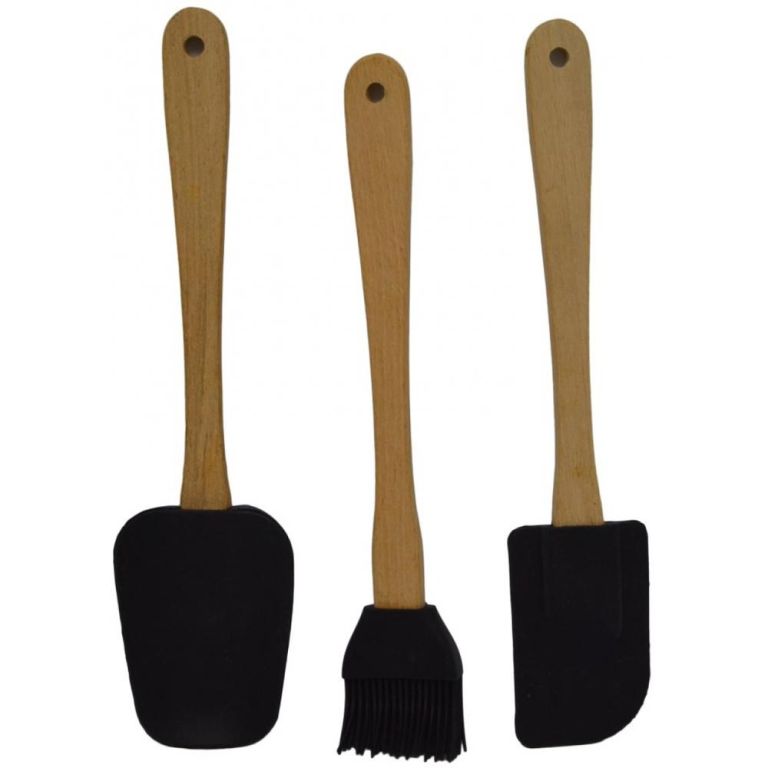 Σετ τριών τεμαχίων εργαλεία κουζίνας το οποίο αποτελείται από δύο διαφορετικές σπάτουλες και ένα πινέλο, με ξύλινες εργονομικές λαβές και μαύρη σιλικόνη.