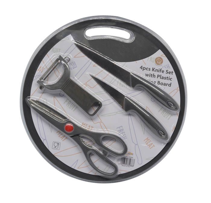Σετ 4 τεμαχίων εργαλεία κουζίνας με πλαστικό δίσκο κοπής σε γκρι χρώμα. Το σετ αποτελείται από δύο μαχαίρια γενικής χρήσης με γκρι εργονομική λαβή, έναν αποφλοιωτή και ένα ψαλίδι κουζίνας. Ο δίσκος έχει διάμετρο 30,3εκ.